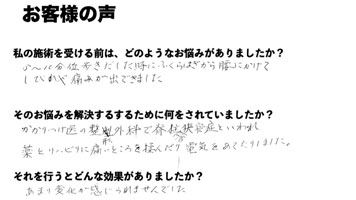 膝の痛みが続いていて、日常生活の中でも不安を感じることがありました。 年齢のせいもあるのかなと思いながら、どうしたらいいのか分からず悩んでいました。