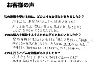 こんなに痛みがあっても治るものなのかしら?と思っていましたが、1回目の施術が終わって帰りには楽になっていました。やはりここに頼って良かったと思いました。先生を信じて良くなるまで続けようと思いました。